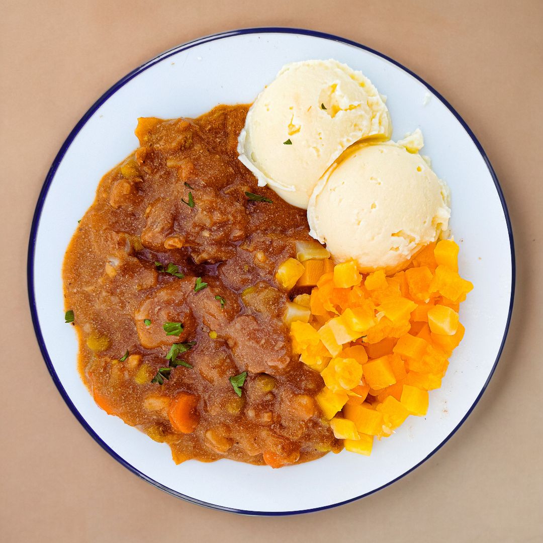 Beef, Water, Butternut squash, Onions, Dehydrated potato (potatoes, vegetable oils (canola oil, palm oil and/or sunflower oil), salt, mono and diglycerides, colors (titanium dioxide, riboflavin), ascorbic acid (vitamin C), natural and artificial flavor, butter oil, sodium bisulfite, sodium acid pyrophosphate, BHT, citric acid), Country style potatoes (potatoes, canola oil, sodium phosphate, dextrose), Peas, Carrots, Crushed tomatoes (tomatoes, salt, citric acid), Modified starch (corn, tapioca or potato), Beef bouillon (sugars (glucose solids, dextrose, sugar), salt, corn starch, flavour, colour (caramel), onion powder, vegetable oil (canola oil, extra virgin olive), beef extract, disodium guanylate, disodium inosinate, spices (celery)), Sugar, Canola oil, Flavour (flavour, salt, yeast extract), Xanthan gum, Salt, Caramel colour (sulphites), Spices.