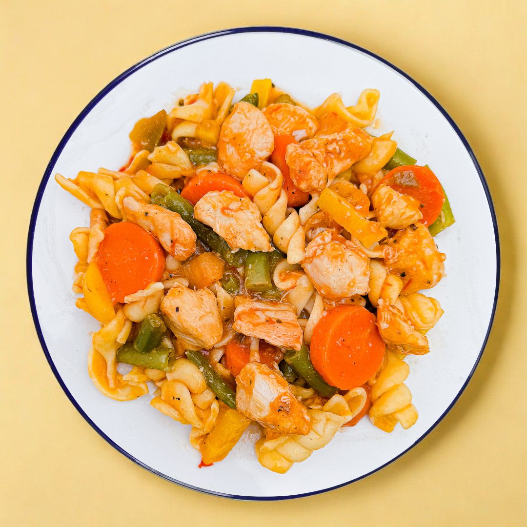 Water, Vegetable blend (green beans, orange carrots, yellow carrots), Seasoned chicken breast (chicken breast fillets, water, modified corn starch, salt), Pasta (durum wheat semolina, niacin, ferrous sulphate, thiamine mononitrate, riboflavin, folic acid), Vegetable blend (red, green and yellow peppers, onions), Crushed tomatoes (tomatoes, salt, citric acid), White wine (sulphites), Tomatoes (tomatoes, tomato juice, salt, calcium chloride, citric acid), Canola oil, Modified starch (corn, tapioca or potato), Chicken seasoning (salt, dehydrated chicken, chicken fat (rosemary extract), rice flour, sugar, dehydrated vegetables (onions, garlic), spices (celery), turmeric), Xanthan gum, Yeast extract, Paprika, Spices.