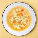 Water, Chicken, Onions, Carrots, Pasta (durum wheat semolina, egg white powder (egg whites, baker's yeast, citric acid), niacin, ferrous sulphate, thiamine mononitrate, riboflavin, folic acid), Modified starch (corn, tapioca or potato), Chicken seasoning (salt, dehydrated chicken, chicken fat (rosemary extract), rice flour, sugar, dehydrated vegetables (onions, garlic), spices (celery), turmeric), Salt, Parsley flakes, Spices.