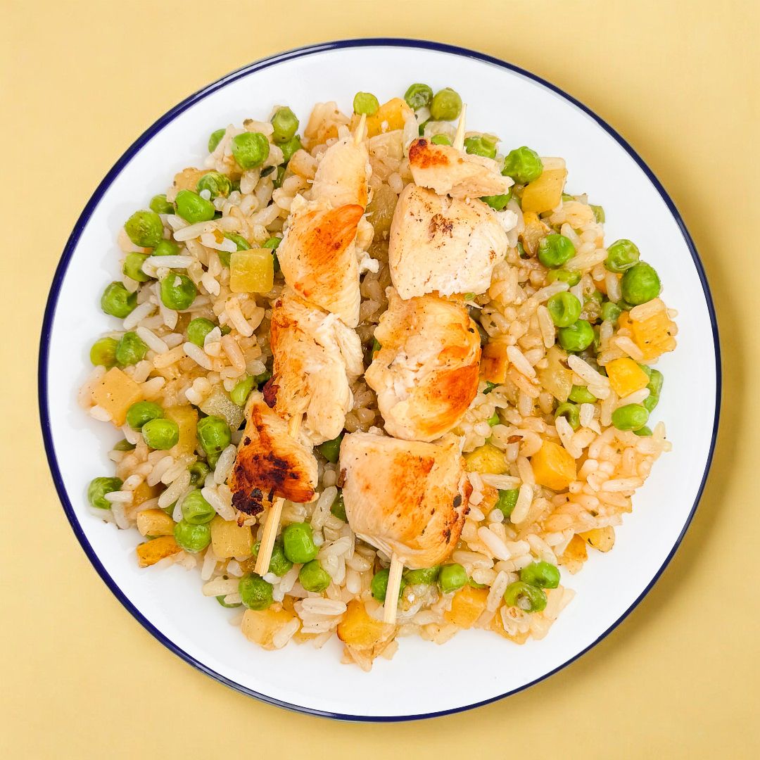 Cooked rice (water, rice, sunflower oil), Seasoned chicken breast (chicken breast fillets, water, modified corn starch, salt), Water, Turnips, Peas, Concentrated lemon juice, Onions, Modified starch (corn, tapioca or potato), Canola oil, Garlic (dehydrated garlic, water, canola oil, citric acid), Vegetable broth flavour (yeast extract, salt, carrot powder, tomato powder, onion powder, leek powder, garlic powder, herbs and spices (bay leaf, celery, thyme)), Red wine vinegar (sulphites), Salt, Xanthan gum, Paprika, Herbs, Spices.