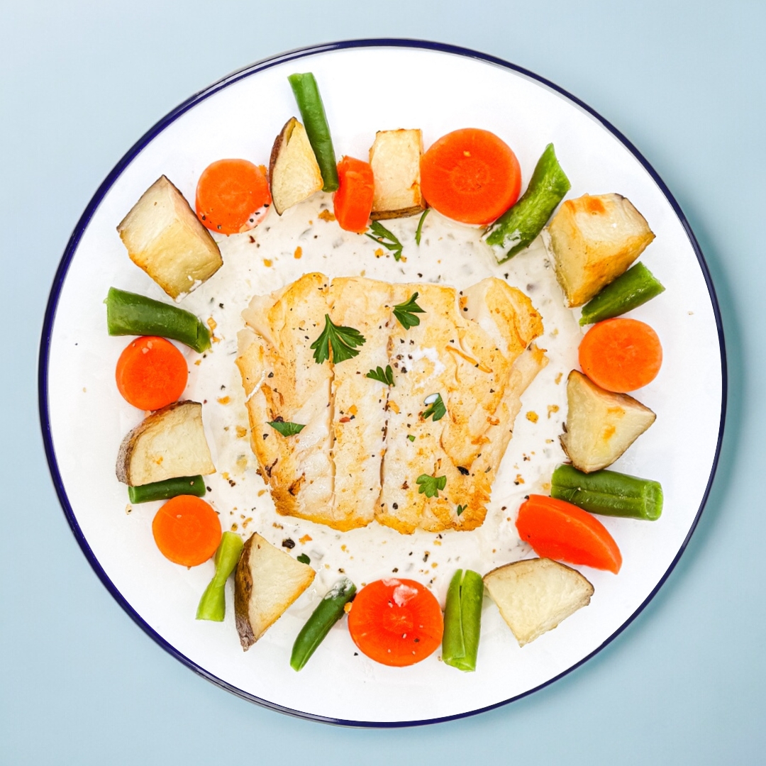 Cod with a creamy herb sauce served with red-skinned potatoes and mixed carrots and green beans. 285g