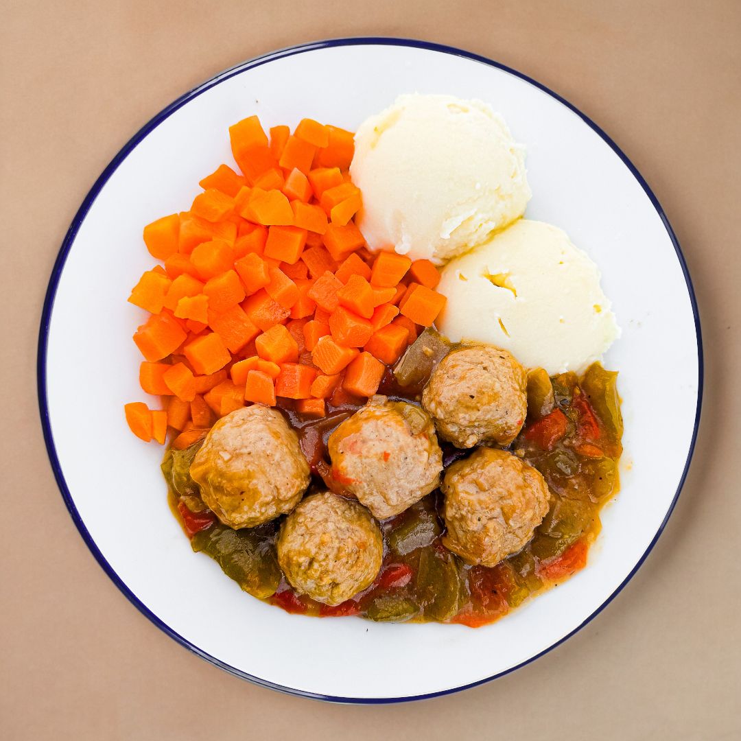 Water, Beef meatballs (beef, water, textured protein concentrate (caramel), liquid whole eggs, soy protein concentrate, corn syrup solids, breadcrumbs, textured soy flour, dehydrated onions, salt, romano cheese, natural flavour, sodium phosphate), Carrots, Vegetable blend (red, green and yellow peppers, onions), Dehydrated potato (potatoes, vegetable oils (canola oil, palm oil and/or sunflower oil), salt, mono and diglycerides, colors (titanium dioxide, riboflavin), ascorbic acid (vitamin C), natural and artificial flavor, butter oil, sodium bisulfite, sodium acid pyrophosphate, BHT, citric acid), Tomatoes (tomatoes, tomato juice, salt, calcium chloride, citric acid), Beef bouillon (sugars (glucose solids, dextrose, sugar), salt, corn starch, flavour, colour (caramel), onion powder, vegetable oil (canola oil, extra virgin olive), beef extract, disodium guanylate, disodium inosinate, spices (celery)), Modified starch (corn, tapioca or potato), Canola oil, Salt, Yeast extract, Xanthan gum, Spices. CONTAINS:Soy, Eggs, Milk, Wheat (gluten), and Sulphites
