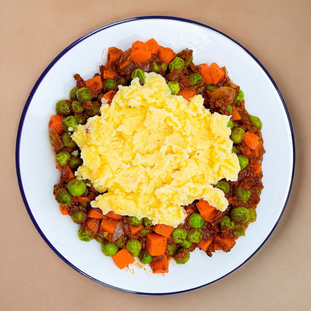 Water, Vegetable blend (peas, carrots), Lean ground beef, Dehydrated potato (potatoes, vegetable oils (canola oil, palm oil and/or sunflower oil), salt, mono and diglycerides, colors (titanium dioxide, riboflavin), ascorbic acid (vitamin C), natural and artificial flavor, butter oil, sodium bisulfite, sodium acid pyrophosphate, BHT, citric acid), Onions, Modified starch (corn, tapioca or potato), Crushed tomatoes (tomatoes, salt, citric acid), Beef bouillon (corn syrup solids, salt, corn starch, flavour, caramel colour, onion powder, vegetable oil (canola oil, extra virgin olive), beef extract, dextrose, sugar, disodium guanylate, disodium inosinate, spices (celery)), Canola oil, Caramel colour (sulphites), Xanthan gum, Salt, Spices.
