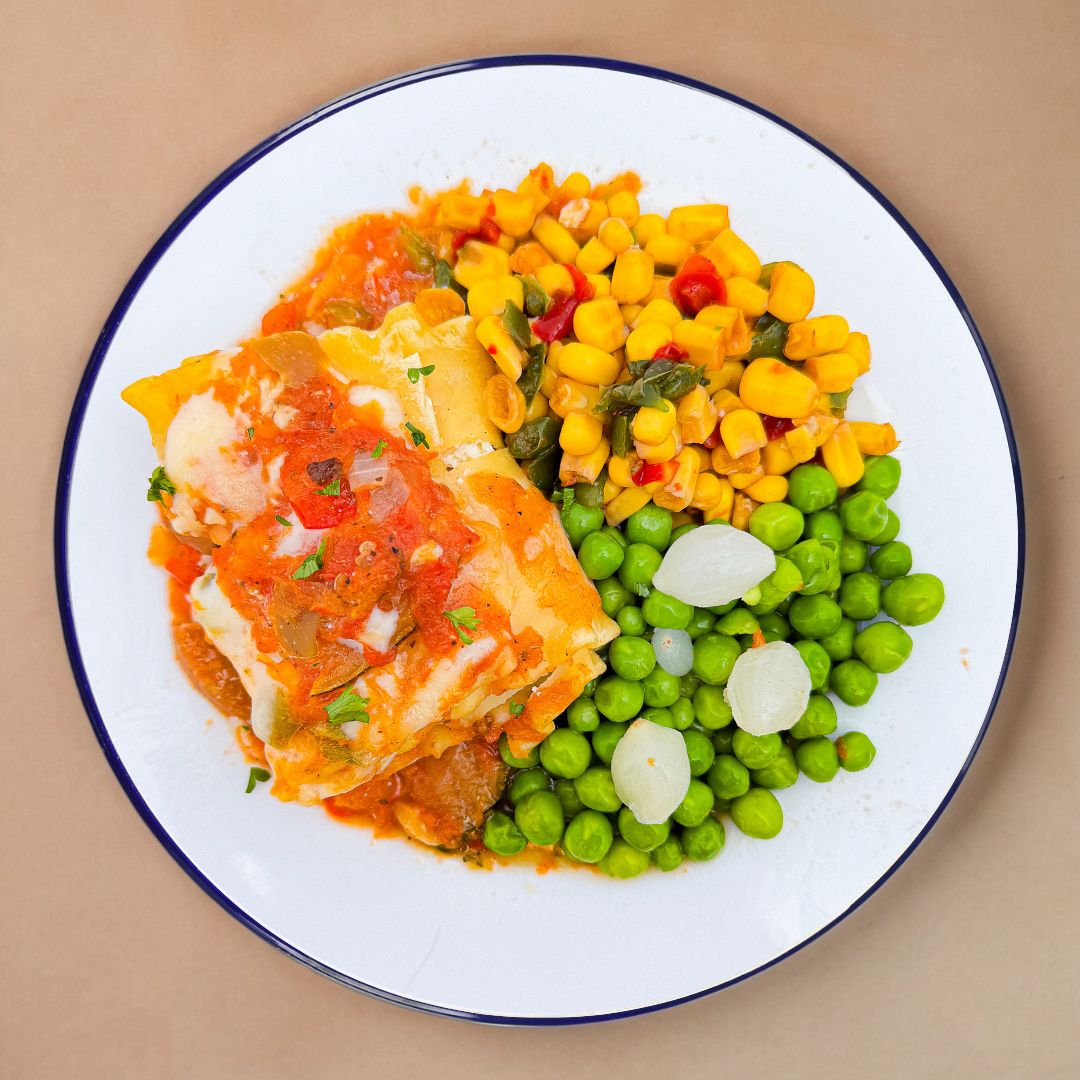 Lasagna roll (ricotta (pasteurized milk and whey, bacterial culture, salt, citric acid), liquid whole eggs, toasted wheat crumbs, salt, garlic powder, onion powder, pasta (durum wheat semolina (niacin, ferrous sulphate, thiamine mononitrate, riboflavin, folic acid)), water), peas, corn, water, mozzarella cheese (pasteurized milk, modified milk ingredients, bacterial culture, salt, calcium chloride, microbial enzyme, cellulose, natamycin), green peppers, red peppers, crushed tomatoes (tomatoes, salt, citric acid), tomatoes (tomatoes, tomato juice, salt, calcium chloride, citric acid), zucchini, mushrooms, onions, modified starch (corn, tapioca or potato), canola oil, salt, garlic (dehydrated garlic, water, canola oil, citric acid), sugar, xanthan gum, spices.