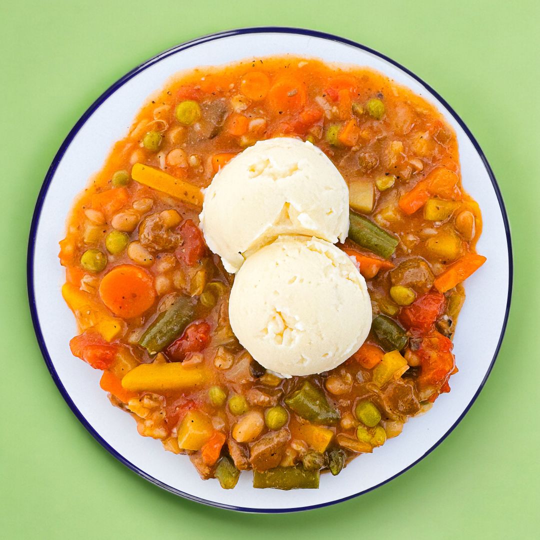 Vegetarian Stew (Water, Vegetable blend (green beans, orange carrots, yellow carrots), Tomatoes (tomatoes, tomato juice, salt, calcium chloride, citric acid), Dehydrated potato (potatoes, vegetable oils (canola oil, palm oil and/or sunflower oil), salt, mono and diglycerides, colors (titanium dioxide, riboflavin), ascorbic acid (vitamin C), natural and artificial flavor, butter oil, sodium bisulfite, sodium acid pyrophosphate, BHT, citric acid), Crushed tomatoes (tomatoes, salt, citric acid), Navy beans (white beans, water, salt, calcium chloride, disodium EDTA), Peas, Potatoes, Onions, Mushrooms, Celery, Carrots, Textured soy protein (soy flour, caramel colour (contains sulphites)), Barley, Modified starch (corn, tapioca or potato), Canola oil, Vegetable seasoning (salt, dehydrated vegetables (peas, carrots, onions, leeks, garlic), sugar, spices (celery), dehydrated yellow peas, paprika), Garlic (dehydrated garlic, water, canola oil, citric acid), Salt, Parsley, Xanthan gum, Paprika, Black pepper, Rosemary). MAY CONTAIN: Mustard and Other Sources of Gluten